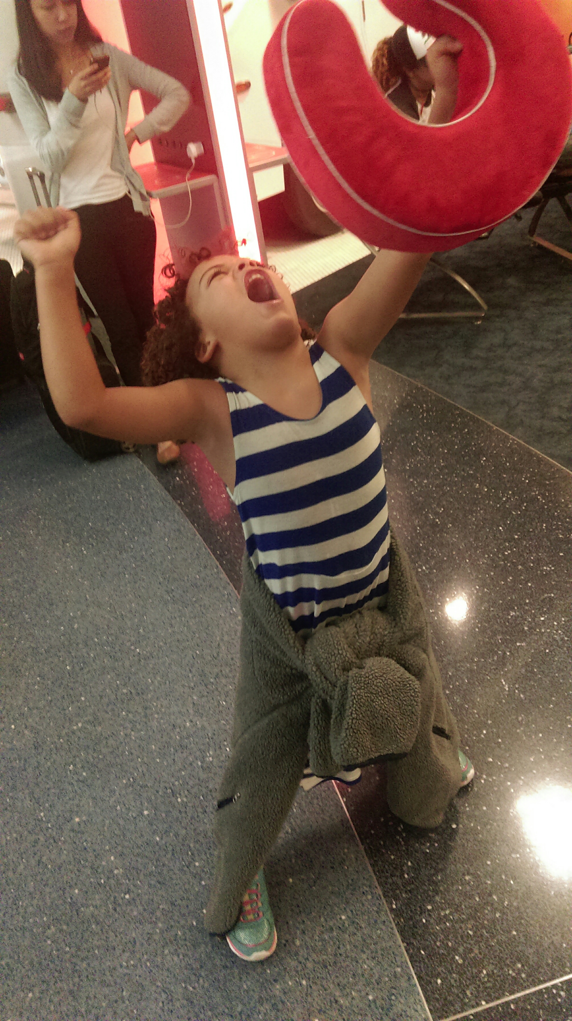 We rush inside to security checkpoint and watch a tour group of 50+ students get in line in front of us. We take the elevator while they take they escalator and get hung up by a TSA agent checking their IDs. We swoop in front of them and get through security. I throw our several shirts and sweatshirts on the security belt and walk through the metal detector with panties in my pocket. It’s 5:50am.